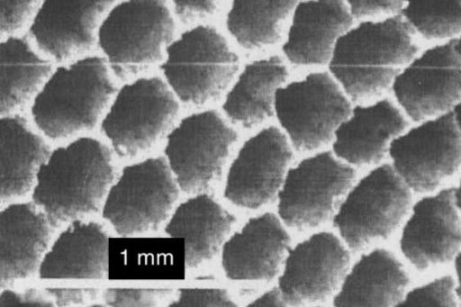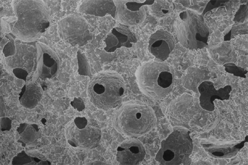 The first picture shows an aluminium foam, the second is a cellular iron-based material with cells extending in one dimension (MER Corp.), the third represents ordinary sintered bronze powders which actually form a metal sponge (instead, however, such structures are rather called "sinter metal" or even "porous metal"), the fourth shows an aluminium sponge, which could also be called cellular if one relaxes the condition that the cells be closed. The fifth shows a nickel sponge (Inco).